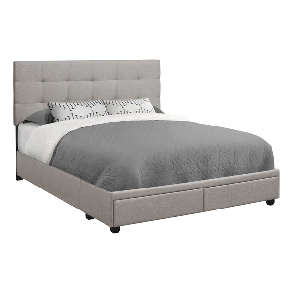 Comfort and convenience come together in this upholstered platform bed with 2 storage drawers. A grey linen-look fabric covers the bed frame and the tufted headboard, giving the bed a soft, comfortable feel all around. For a clean, modern look, the storage drawers are built into the foot of the bed and glide smoothly on drawer slides. With its contemporary style and practical design, this bed is an ideal solution for bedrooms in need of extra storage space.. Queen-size platform bed with 2 storage drawers located at the foot of the bed (mattress not included). Upholstered in grey linen-look fabric with a tufted headboard. Bed frame features wooden slat supports and solid wood legs for durability and stability; no box spring needed. Assembly required: Parts and hardware are enclosed within the headboard, accessible through the back panel; illustrated instructions are provided for convenience (additional tools may be needed). Product dimensions: 84 inches L x 64 inches W x 46.25 inches H; the drawer interiors each measure 16.75 inches L x 28.5 inches W x 4 inches H