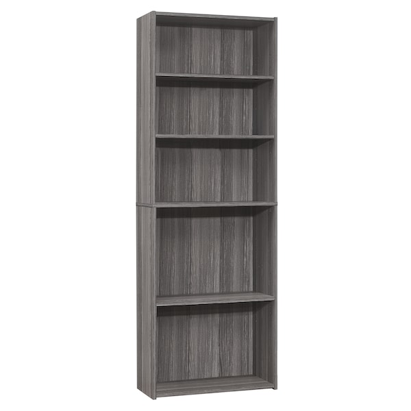 This 5-shelf bookcase in a simple, clean and space-saving design makes it a versatile storage option for any room in your home. The strong adjustable shelving allows for various sized objects to be displayed in your own creative way. Constructed from engineered materials in a sophisticated grey wood-look laminate finish, this transitional style bookcase can easily be used in a living room, home office, or bedroom to store books, toys, and decorative accents. Tipping hardware is included to secure safely to a wall. Assembly is required.. 3 adjustable shelves and 2 fixed shelves. Space saving, transitional / contemporary style suitable for any room. Tipping hardware included for extra security. Elegant grey wood-look finish on 3 sides.