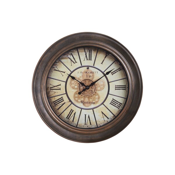 - An elegant, transitional style, 15" round wall clock in a vintage design, with a durable antique brown plastic frame and a quality glass surface.