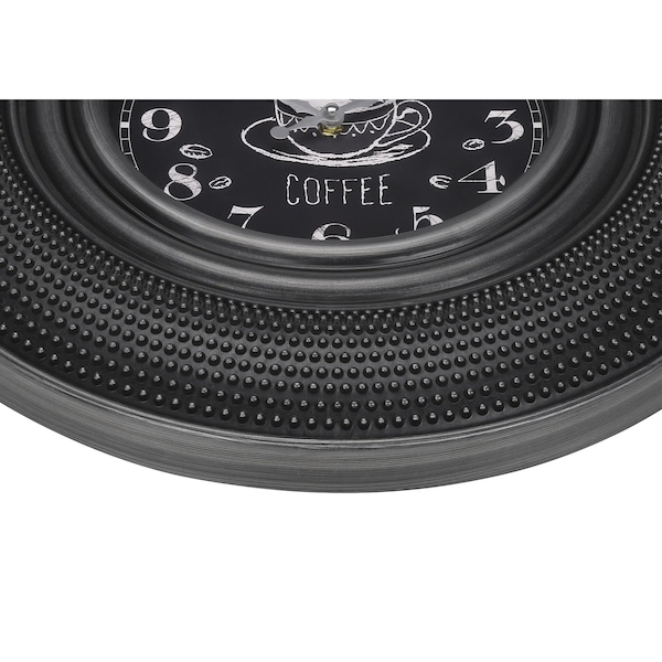 Add some charm to your home decor with this transitional style 20" round wall clock in charcoal grey. Made using high quality materials, this decorative clock features a sleek, textured plastic frame and a protective glass surface against a chalkboard inspired coffee backdrop for a touch of sophisticated whimsy. This analog clock also offers accurate timekeeping with its reliable quartz movement and easy to read numerical markings. No assembly is required, simply insert 1 AA battery battery not included, hang it up and enjoy! With a non ticking mechanism to keep your surroundings quiet and free from distraction, this transitional style clock will make just the right statement and help you stay on time! For indoor use only.