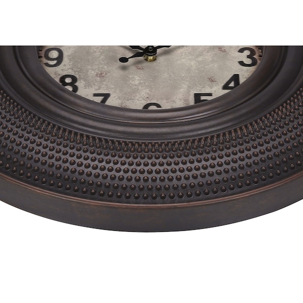 Add a touch of vintage charm to your home decor with this stunning 20" round wall clock in antique brown. This decorative clock features easy to read, printed numerical markings under a glass surface and a non-ticking quartz movement for accurate timekeeping. With a durable and stylish beaded plastic frame and no assembly required, just pop in 1 AA battery not included and enjoy the quiet elegance of this analog clock. Make a statement with this transitional accent piece that seamlessly combines functionality with style.