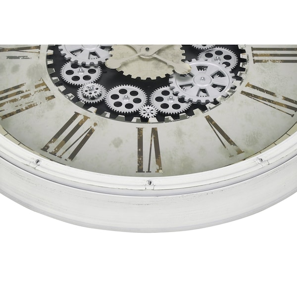 Stay right on trend with this chic 30" round wall clock in white, featuring an exposed gear mechanism design. This large, oversized wall clock in a transitional style is crafted with a durable plastic frame and a clear glass surface over the easy to read, printed roman numeric markings. The quartz movement on this analog ensures accurate timekeeping, while the moving white metal gears adds a unique vintage touch to this non-ticking clock. No assembly is required, simply insert 3 AA batteries not included, hang it up and let this clock become the focal point in your decor. Transform that empty wall space with this elegant oversize clock if you are looking to add a stylish and functional piece to your home decor.