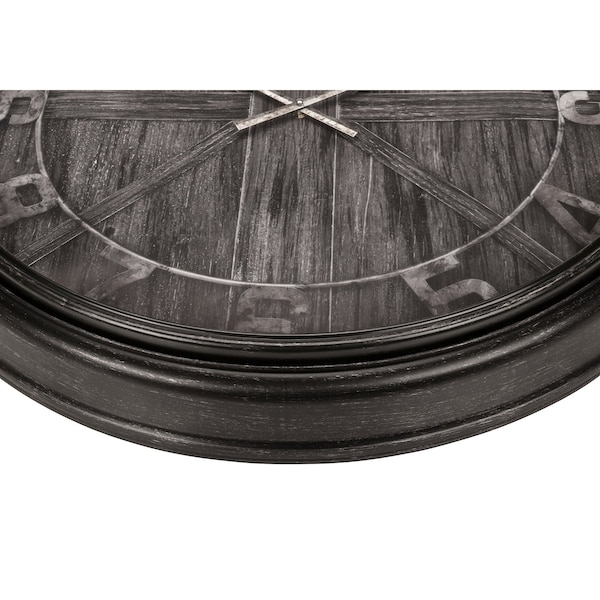Stay ahead of the trend with this stylish 30" round wall clock in a chic brown finish. This large oversized clock features a durable glass surface and plastic frame with a wood-look printed face, for a touch of rustic sophistication in transitional home decors. The easy to read analog display comes with reliable quartz movement for accurate timekeeping. Say goodbye to annoying ticking sounds with this non-ticking clock that is perfect for quiet spaces. Plus, with no assembly required and only 1 AA battery needed not included, this decorative clock becomes a hassle-free addition in your space.