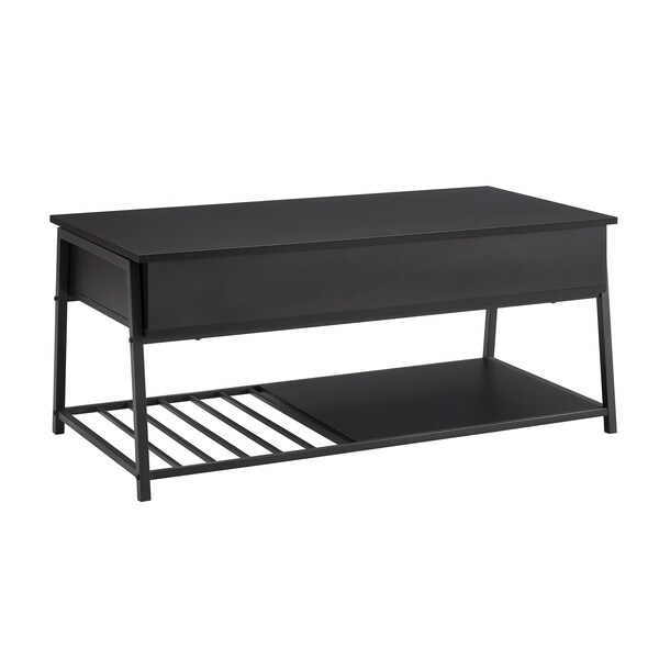 Introduce some modern style with practicality to your living space with this contemporary 42" long, lift-top coffee table. Crafted with a durably designed black laminate top and a sleek black metal base, this rectangular coffee table offers a convenient lift-top feature that effortlessly transforms into a stylish workspace, perfect for enjoying coffee while catching up on emails or indulging in a snack during movie night. The easy-to-clean top makes maintenance a breeze but that's not all! This coffee table prides itself on its ample closed storage and a bottom shelf partially covered with a laminate top that caters to your organizational needs_x0014_ keeping your living space tidy while showcasing your favorite decor.It arrives at your doorstep with an easy-to-assemble design, illustrated instructions and all necessary parts, allowing you to enjoy your new centerpiece in no time. Transform your living room with this chic cocktail table that fits right in with contemporary decors showcasing the ultimate blend of style and utility.