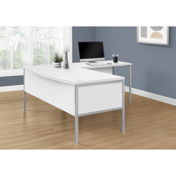 Elevate your home office or workspace with this stylish and functional computer desk. Measuring 72"l, this contemporary desk is designed to meet ANSI / BIFMA quality safety standards, ensuring durability and safety for all your work needs. The curved sleek white laminate top is scratch, stain, and wear-resistant, making it perfect for daily use. This fashionable style desk includes a file storage drawer for letter or legal sized folders and a lockable top drawer which can be assembled on the left or right hand side, along with capped cable management holes at each end of the top for a highly functional commercial grade desk. The silver metal adjustable legs add a modern touch to any room, while the fully finished back allows for versatile placement within your space. This computer desk is durably designed and easy to assemble with full illustrated instructions included. Offering plenty of room on the easy to clean top, this desk provides a comfortable and organized space for studying, writing, or using your laptop. Create a fashionable and functional workspace for the home office or commercial environments with this professional grade desk.