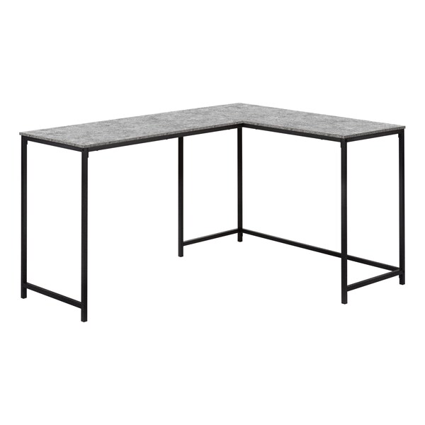 Delivering the best of both worlds, this corner computer desk is both spacious and compact, with a streamlined style that is a great choice for smaller home offices. Finished in a grey stone-look laminate, the large desktop easily accommodates everything you need to be productive and has room to spare for displaying decorative items. Supporting the desktop is a slender metal base in a contrasting black finish. The open design of the metal base leaves plenty of room underneath the desktop to stretch your legs and place a computer tower. This L-shaped computer desk is designed for placement in a corner to maximize space in a home office.
