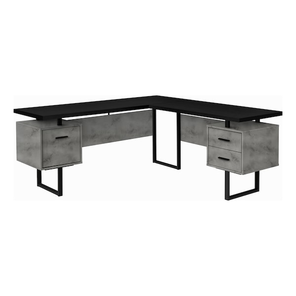 Give your home office a promotion with this extra-large, corner desk. The L-shaped, floating desktop in a black finish is generously sized and leaves space to use the tops of the grey concrete-look drawer units as shelves. A reversible configuration lets you set up the desk with the drawer units on either side as desired. The space between the 3 storage drawers allows ample room to easily move around your workspace. Providing support are 3 robust metal legs in a black finish that matches the drawer handles. This L-shaped computer desk saves space when used in a corner but is finished on all sides for a polished look wherever it is placed in a home office.