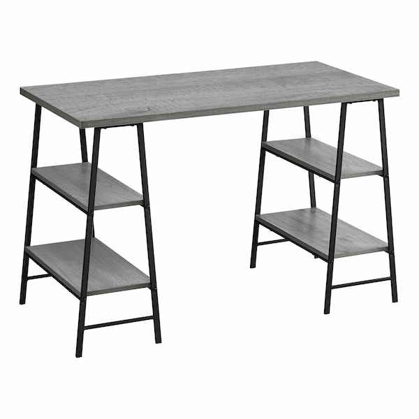Make your computer desk work as hard as you do. This desk delivers style and functionality from top to bottom, starting with its thick and spacious desktop in a grey wood-look finish. Sawhorse-style legs in black metal are put to work as supports for 4 open shelves that can be used to display books, small storage boxes, or other items. The unique, compact design of this industrial-style writing desk maximizes space and storage potential so that you can maximize productivity.