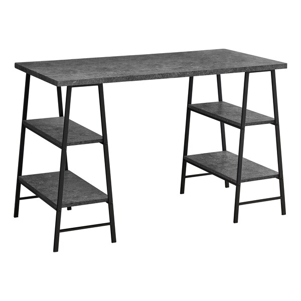 Make your computer desk work as hard as you do. This desk delivers style and functionality from top to bottom, starting with its thick and spacious desktop in a grey stone-look finish. Sawhorse-style legs in black metal are put to work as supports for 4 open shelves that can be used to display books, small storage boxes, or other items. The unique, compact design of this industrial-style writing desk maximizes space and storage potential so that you can maximize productivity.. Industrial-style computer desk with 4 fixed, open shelves supported by sawhorse-style legs in a black metal finish. Thick, rectangular desktop and 4 shelves in 2 different sizes are finished in a textured, grey stone-look laminate. Great for small workspaces in need of storage options, this 3-tier writing desk has a space-saving, open-concept design and is finished on all sides for flexible placement anywhere in your home office. Assembly required: Illustrated instructions and all hardware are provided for convenience (additional tools may be needed).