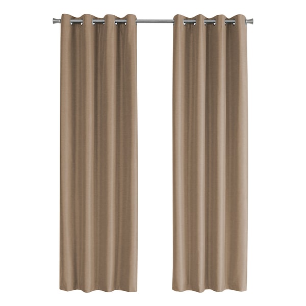 Give your space a luxurious look with this set of two blackout curtain panels in a warm light brown finish. Each 52"W x 84"H unlined curtain panel is embedded with solid blackout material blocks out the light when needed, and provides thermal insulation from the heat and cold. The sumptuous, wrinkle free soft polyester fabric give an air of elegance to a room, and the 8 silver metal grommets on each panel makes it a quick setup. The simple classic design of these curtains are versatile enough to hang in a livingroom, bedroom, or dining room. Panels are dry clean only. Curtain rod not included and must be purchased separately.