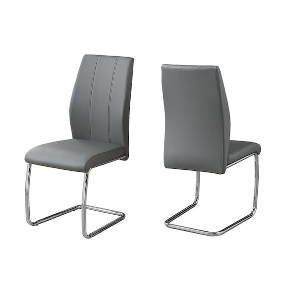 Show off these two up-to-the-minute kitchen chairs with confidence. They are made of a smooth upholstered grey leather look material with sturdy luxurious chrome metal bases in a U shape. Enjoy the enhanced comfy seat that will make a statement in your small home, apartment or condo. These armless dining room chairs will slide perfectly under the table to save space when not in use. Don't forget to match with an identical kitchen table to complete your stylish kitchen or dining room collection. . Set of 2 upholstered dining chairs boasting a unique contemporary style . Supported by a solid U-shaped chrome metal base, these kitchen chairs are upholstered in a grey easy-to-clean leather-look material with two vertical rows of stitching for added elegance . The dining room chairs boast cushioned seats to allow you to dine in comfort . Pair easily with a matching kitchen table (sold separately) . Product Dimensions: 17 Inch L x 20 Inch W x 39 Inch H