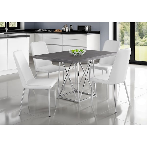 This oh-so-trendy wood-finished dining table is on point with today's styles thanks to its perfect mix of contemporary and minimalist looks. To complete your dining collection, easily pair this kitchen table with 4 matching chairs of your choice thanks to its up-to-date wood look finish in grey. For your shiny tastes, the chrome metal legs give you that added elegance in the dining room of your small home, condo or apartment. When in need of a refreshment, here's your solution. Chairs sold separately.. In a versatile grey wood look finish, this dining table fits perfectly in today's dining or even work spaces in small homes, condos, lofts or apartments.. Use this wood look dining room table for modern or casual dining thanks to a thick table top that gives a rich, full look.. Stylish chrome metal legs have an x-shaped design, which adds a contemporary element to the wood dining table.. The table comfortably seats up to 4 people (chairs sold separately).. Product Dimensions: 48 Inch L x 36 Inch W x 31 Inch H
