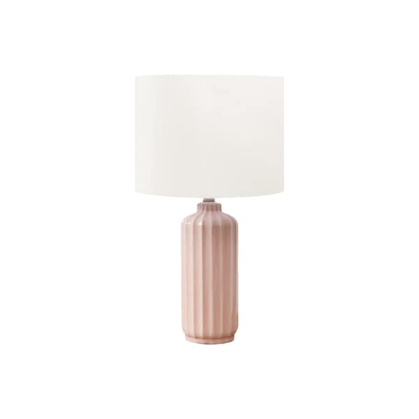 Beautify your space with this fashionable and stylish 23"h glossy pink ceramic table lamp. Composed of high-quality ceramic material in a chic ribbed design, this decorative lamp is complimented with a sophisticated ivory fabric shade that diffuses the light beautifully, generating a warm ambiance that brightens your end or side table, nightstand, or bedside table. Equipped with an easy on/off turn knob switch for effortless control, this lamp operates with a standard 100W bulb (not included) to create a welcoming atmosphere. Well suited to fit all decor styles, illuminate your living room, bedroom, or office with this versatile and on-trend table lamp with a columnar shape base, adding dimension to a room.