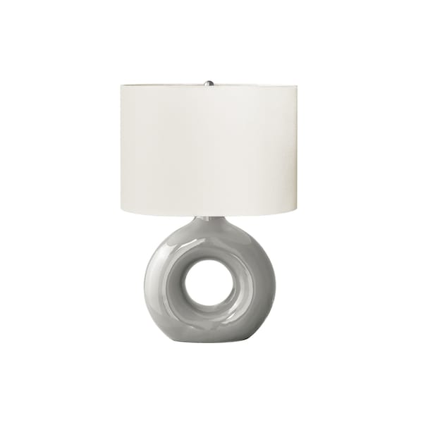 Add some modern ambiance to your home with this stylish and trendy 24"h table lamp in light grey ceramic with a chic ivory shade. This decorative table lamp will brighten up any room with its contemporary, donut-shaped ceramic base and oval linen-blend fabric shade. A perfect size to place on an end or side table, or as a bedside lamp on your nightstand, this lamp will illuminate your space with a soft and inviting glow. Easy to use with an on/off rotary switch that houses a 100W light bulb (not included), this lighting fixture will easily be a standout. With only minimal assembly needed.