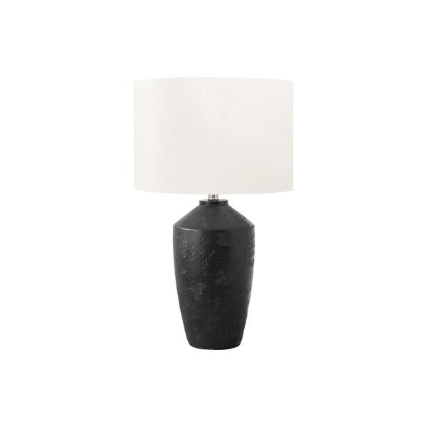 Update your living room, bedroom, or office into a beacon of modernity and elegance with this 25"h table lamp. Designed with a bold black concrete base in an aged finish, this lamp pairs beautifully with the modern ivory fabric shade that softly diffuses the light, creating an inviting ambiance that is both decorative and functional. Place this contemporary accent piece on any end or side table, a console, or on a nightstand to effortlessly illuminate a room. This decorative lamp has a convenient 3-way switch compatible with a 3-way bulb up to 100W (not included), allowing you to adjust the lighting to whatever mood you desire, whether for reading, relaxing, or entertaining. Brighten your home with this new favorite lighting solution that combines a textured concrete base with a contemporary drum ivory shade.