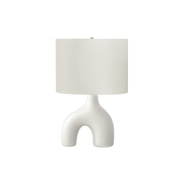 Add a fun and decorative element to your home with this stylish, mid-century inspired 25"h table lamp in white ceramic with an elegant linen ivory shade. This decorative table lamp will brighten up any room with its contemporary and whimsical two-leg shape ceramic base and linen-blend fabric shade. A perfect size to place on an end or side table in your living room or office, or as a bedside lamp on your nightstand in your bedroom, this lamp will illuminate any space with a soft and inviting ambiance. Easy to use with an on/off rotary switch that houses a 100W light bulb (not included), this lighting fixture will be a standout in your space. Only minimal assembly is needed.