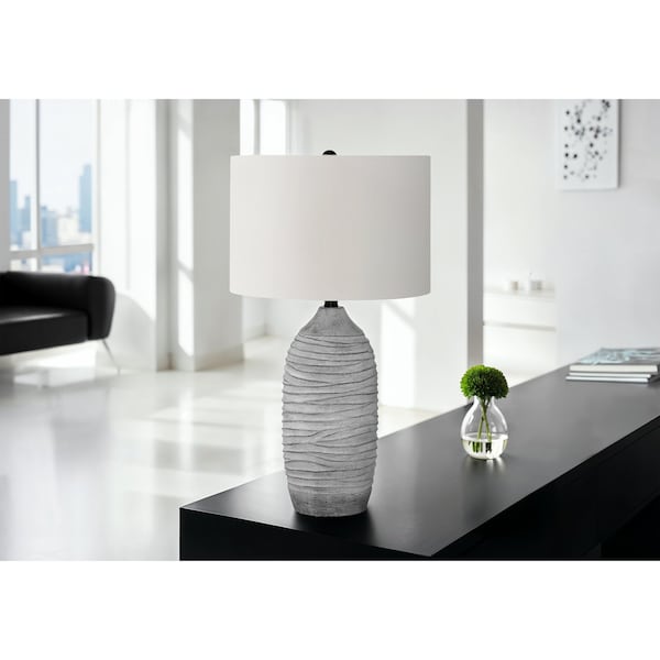 Bring some modern sophistication to any room with this stylish 27h table lamp. A beautiful blend of a textured grey resin vase-shaped base designed with organic flowing lines, an ivory linen drum shade, and finished with a contrasting black metal finial on top, this lamp is a great way to brighten any bedroom, living room or office. With a 3-way switch that houses a single bulb not included for a maximum output of 100W/120V, this lamp offers three levels of illuminating light for creating the ambiance you desire. Attached with a 5ft transparent cord, this is the perfect functional accent to place on an end or side table, nightstand or bedside table. Made with quality material.