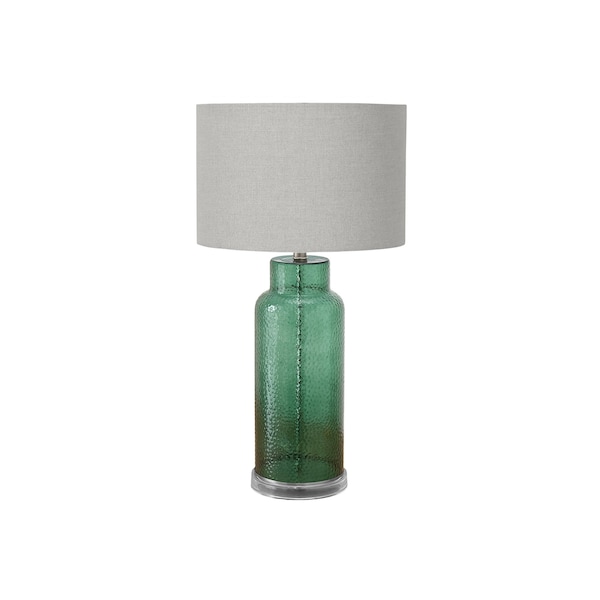 Crafted with a textured green glass body and supported by a clear acrylic base, add this chic, 28"h decorative table lamp in your living room, bedroom, or home office for an instant transformation. This contemporary lighting piece combines functionality with fashion, making it the perfect accent for any end or side table, console, or nightstand. The stunning glass base in a sleek cylinder shape is more than just lighting but a statement of style. The sophisticated grey fabric shade adds a modern touch, creating a warm ambiance that brightens up your space without overwhelming it. The convenient on/off turn knob switch works with a standard 100W bulb (not included), making it practical for daily use, whether enjoying a quiet evening reading by the light or hosting friends in your living room. Illuminate your decor with this stylish, fashionable and trendy lighting option that speaks to your modern sensibilities.