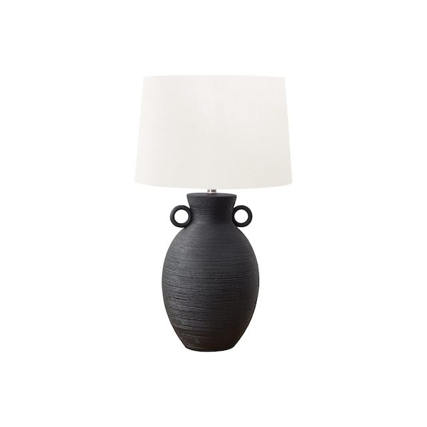 This eye-catching, 30"h table lamp is the epitome of fashion and elegance that will bring transitional decors to new heights! Featuring a black ceramic base with a fine, ribbed texture, accented with circular handles on either side of the vase shape design, and topped with a contemporary ivory fabric shade to transform your living room, bedroom, or office into a stylish sanctuary. Perfect for accenting any end or side table, a console, or nightstand this lamp not only serves as a source of lighting but also as a statement piece for fashion-forward customers looking to elevate their decor. The 3-way switch allows you to easily adjust the ambiance when paired with a 3-way bulb up to 100W (bulb not included), whether to brighten your space for a lively gathering or create a cozy atmosphere for a quiet evening. Stay fashionable and trendy with this versatile lighting option that seamlessly transitions from modern to transitional decor styles.