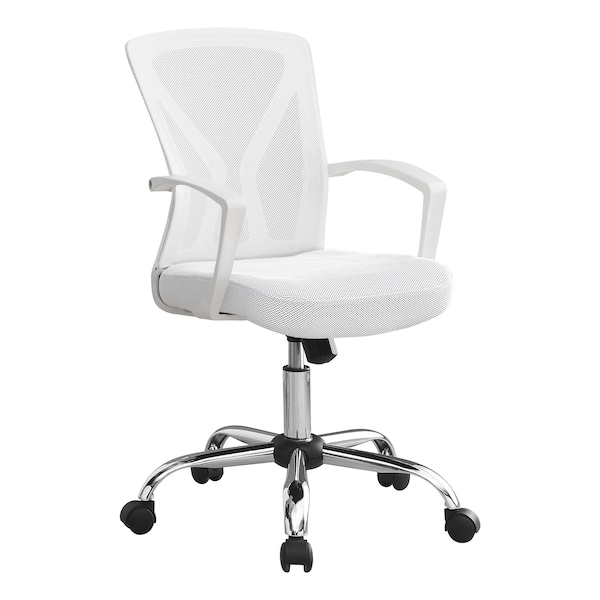 This mid-back office chair with fixed armrests in white has your back if you need a supportive, comfortable, and stylish desk chair. The backrest has a curved, ergonomic shape that promotes good posture. The seat is deep and extra wide with generous padding to offer a roomy feel. White mesh fabric that allows air to circulate covers the swivel seat and backrest. The backrest exterior features supports that are both decorative and functional. These supports add visual interest and can be used as handles when you move this adjustable-height chair that has a 5-star base finished in chrome, with black casters for mobility. Ideal for smaller spaces, this chair will bring streamlined style to your office._x000D_
