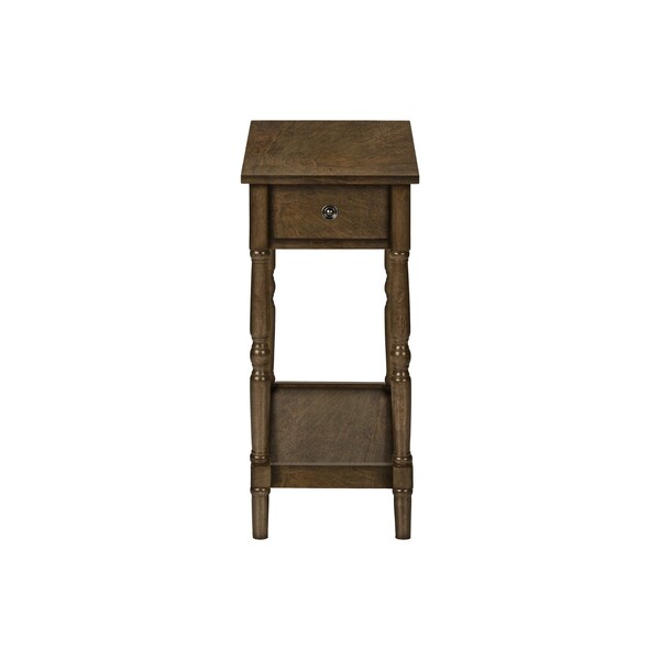 This fashionable and practical 25 inch high accent table is a must-have piece for your home. With a space saving design, this 2 tier side table is perfect for small spaces with its narrow profile to set next to an armchair or sofa in a living room with a small lamp on top, or as a nightstand in the bedroom. The warm brown veneer finish with slim turn post legs adds a touch of traditional elegance to any room, while the storage drawer and bottom shelf allows you to conveniently keep essentials within reach. Easy to assemble with illustrated instructions, all hardware and floor protectors included so you can have this versatile accent table setup and ready to enjoy.