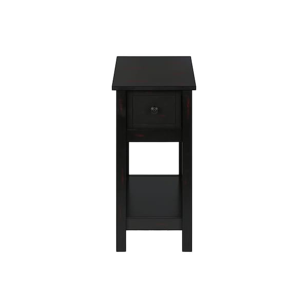 This practical 24 inch high accent table with fashionable style is a must-have piece for your home. With a space saving design, this 2 tier side table is perfect for small spaces with its narrow profile to set next to an armchair or sofa in a living room with a small lamp or decorative objects on the easy to clean top, or as a charming nightstand in the bedroom. The black veneer finish with sturdy straight solid wood legs brings some warmth to a space. The storage drawer on easy metal glides is accented with a black metal knob and the roomy bottom shelf allows you to conveniently keep essentials organized and within reach. Easy to assemble with illustrated instructions, all hardware and floor protectors are included so you can have this versatile accent table setup and ready to enjoy.