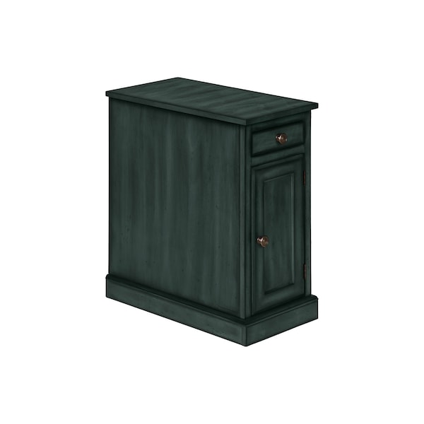 - Versatile with fashionable style, narrow side accent table in a rich antique blue veneer finish with a storage drawer to use in a living room as an end table or in the bedroom as a convenient nightstand.
