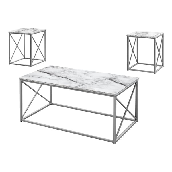 Table Set, 3pcs Set, Coffee, End, Side, Accent, Living Room, Metal, White Marble Look, Grey