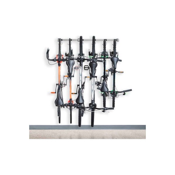 The 6 bike rack by monkey bars securely stores 6 bikes in a compact space. the 6 bike rack's ability to store 6 adult mountain bikes is designed for long term storage, freeing up valuable floor space in your garage. for daily use, it is recommended to store up to 4 bikes, making it easier to get the bikes on and off the rack. The rack is constructed of industrial steel with a gray powdercoat finish built to endure years of heavy use. The large hooks snap and slide along the bar allowing you to choose where to place the bikes along the rack. hooks accommodate wheels up to 4inw and have a soft rubber coating to prevent scratches on your bikes. the rack is 48in wide allowing you to drill the brackets into the wall studs. this rack is strong enough to hold up to 300 lbs. get your bikes up off the floor today, giving you more room for your cars!! . Kit includes 3 brackets, 1 - 51in monkey bar, 6- j hooks, 1 hardware bag and installation instructions. Limited lifetime warranty.