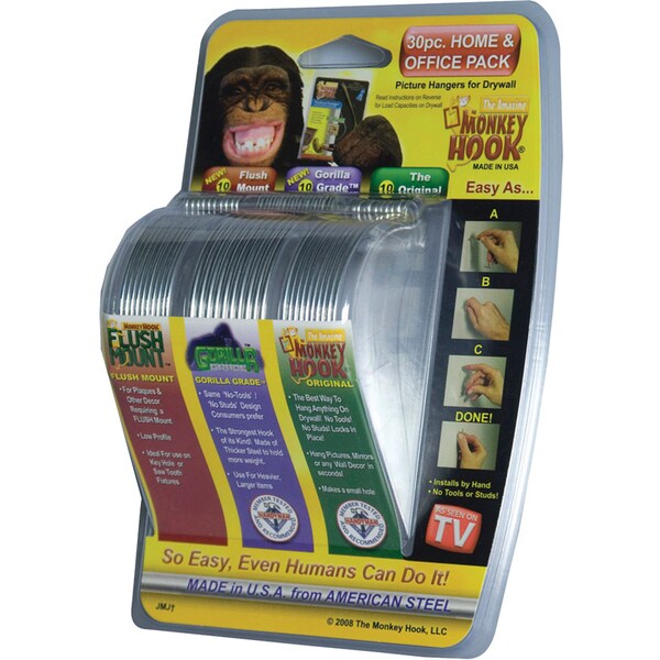 The Monkey Hook is the best way to hang anything on drywall where there is no stud and requires no tools. The Monkey hook is made from high-carbon (ASTM) spring steel of American origin coated with zinc to provide a lifetime of protection. 10 of each of the three varieties (Original 20lb Gorilla Grade 40lb and Flush Mount 10lb) are included in this Variety Pack.