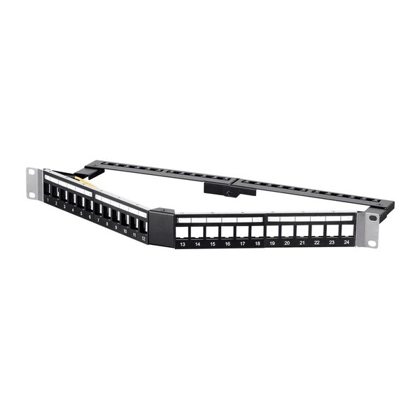 This keystone panel fits into a standard 19" wide equipment rack and measures 1U tall (1.75"). It accommodates up to 24 individual keystones; allowing you to build a custom patch panel with network; audio; and/or video connections. This panel is shielded and features an outward angled orientation for easier access and identification. It is constructed of black painted steel. Each port is individually numbered. This model features a wire support bar for easy cable management.