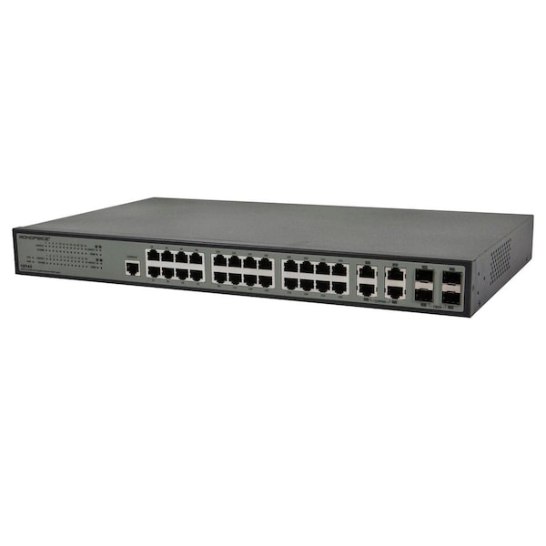 Combine traditional copper Fast Ethernet with fiber optic Gigabit Ethernet in your medium-large business or enterprise using this 24FE+4 Combo-Port Gigabit Ethernet SNMP Switch from Monoprice! This switch is fully compliant with the IEEE 802.3; 802.3u; and 802.3z standards for 10Base-T; 100Base-TX; and 1000Base-X communications. It features twenty-four 10/100 Mbps RJ45 Fast Ethernet ports; plus four ports that are designed to accept both standard copper Ethernet cable as well as fiber optic connections with speeds up to 1000Mbps. The switch supports powerful management functions; including 802.1p (QoS); DiffServ (QoS); IGMP Snooping; 802.1w (Rapid Spanning Tree); Link Aggregation; 802.1q (VLANs); 802.1x and more. Features: 24 10/100Mbps Ethernet ports; 4 Combo Gigabit ports supporting both copper and SFP connections 12.8 Gbps switching fabric capacity IEEE 802.3x compliant Flow Control support for full duplex Supports IEEE 802.1Q VLAN Supports Spanning Tree Protocol Supports Port Mirroring; Flow mirroring Supports LLDP; DLDP Supports DHCP Snooping; Relay and Option 82 Supports IGMP Snooping v1/v2/v3 Supports powerful security functions like ACL; dynamic ARP inspection and more Provides high performance of Store-and-Forward architecture; broadcast storm control Supports SNMP v1/v2c/v3 ; SSH v1/v2 switch management Cisco® is a registered trademark or trademark of Cisco Systems; Inc. and/or its affiliates in the United States and certain other countries.