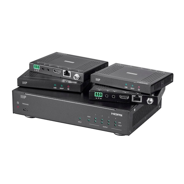 Monoprice's BlackbirdTM 4K HDBaseTTM 1x4 Splitter/Extender is a great tool for splitting and extending HDMI® signals to distances up to 60 meters over a single Cat6 cable. It uses the HDBaseT transmission protocol and supports the Power over Cable (PoC) feature; which means that the receivers can be installed in locations without access to AC power. It supports HDMI resolutions up to 4K and can extend IR signals to control the source device from the remote locations. It also includes support for RS-232 computer control. Features: Supports resolutions up to 4K Transmits 4K video to distances up to 131 feet (40 meters) Transmits 1080p video to distances up to 196 feet (60 meters) Supports the Power over Cable (PoC) feature Supports 5 types of EDID® control Can be cascaded with additional Splitter/Extenders Includes a local HDMI® output port Supports RS-232 computer control IR accessories not included Sample Connection Diagram Support Files: User's Manual (May 31; 2017) BlackbirdTM is a trademark of Monoprice Inc. HDBaseTTM and the HDBaseT Alliance logo are trademarks of the HDBaseT Alliance. HDMI®; the HDMI Logo; and High-Definition Multimedia Interface are trademarks or registered trademarks of HDMI Licensing LLC in the United States and other countries. EDID® is a registered trademark of the Video Electronics Standards Association. HDCPTM is a trademark of Digital Content Protection LLC. Updated Aug 7; 2019