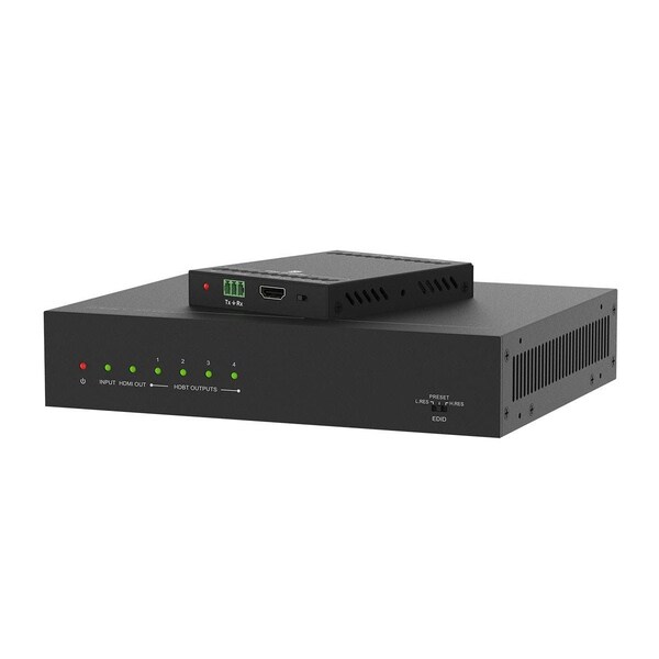 The BlackbirdTM HDBaseTTM 1x4 Splitter and Extender features a single HDMI® input; which splits into four HDBaseT outputs and an HDMI pass-through output for connecting a local HDMI display. It supports video resolutions up to 1080p@60Hz and all HDMI audio formats. It can extend the HDBaseT signal to the included HDBaseT receiver to distances up to 492 feet (150 meters) using a single Cat6 Ethernet cable. It supports the Power over Cable (PoC) feature; which allows the receivers to be powered by the splitter over the Ethernet cable connection. It supports bidirectional IR extension and RS-232 serial control. How it Works Features Splits a single HDMI® input to four HDBaseTTM outputs Includes an HDMI pass-through output for connecting a local display Supports video resolutions up to 1080p@60Hz; as well as all HDMI audio formats Extends 1080p@60Hz signals to distances up to 492 feet (150 meters) over a single Cat6 Ethernet cable Supports the Power over Cable (PoC) feature; allowing the HDBaseT receivers to be powered by the splitter over the Ethernet cables Supports bidirectional IR control Supports RS-232 control Features smart EDID® management with the ability to use fixed EDID using the rear panel DIP switches Compatible with the HDMI 1.4 and HDCPTM 2.2 specifications What's in the Box? 1x BlackbirdTM HDBaseTTM 1x4 splitter and extender • 4x HDBaseT receivers • 2x Splitter short mounting ears • 2x Splitter long mounting ears • 8x Receiver mounting ears • 12x Mounting ear screws • 20x Plastic feet • 1x IR receiver • 4x IR transmitters • 1x RS-232 cable (3-pin to DB9) • 4x 3-pin Euroblock connectors • 1x AC power adapter (24 VDC; 2.71A) with attached NEMA 1-15 US standard plug • 1x User's manual Buy with Confidence Monoprice not only stands behind every product we sell with a 3 year replacement warranty; we offer a 30-day money back guarantee as well! If the product you purchase does not satisfy your needs; send it back for a full refund. Quality at a Fair Price Monoprice's rugged design and rigid quality control standards deliver high quality products at fair prices. Hassle Free Packaging Monoprice exists to bring simplicity; fairness; and confidence to technology choices. This product features recyclable packaging that is simple to open; cost effective; with minimal waste; and fully protective as it travels to you. Service & Support You're never on your own with Monoprice products! We have a full team of friendly and knowledgeable technicians available to answer your questions; both before and after the sale. Contact our technical support team for questions about our products; troubleshooting; or even suggestions for products to fit your particular needs. Not to be outdone; our friendly and helpful customer service team is here to make your ordering; delivery; and any possible returns a quick and painless operation; from start to finish! Support Files: User's Manual (Feb 21; 2018) BlackbirdTM is a trademark of Monoprice Inc. HDBaseTTM and the HDBaseT Alliance logo are trademarks of the HDBaseT Alliance. HDMI®; the HDMI Logo; and High-Definition Multimedia Interface are trademarks or registered trademarks of HDMI Licensing LLC in the United States and other countries. EDID® is a registered trademark of the Video Electronics Standards Association. HDCPTM is a trademark of Digital Content Protection LLC. Updated Aug 13; 2019