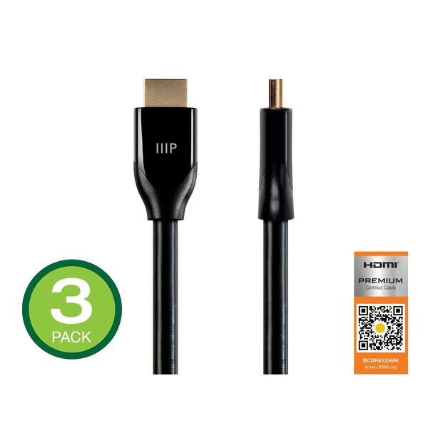 Monoprice's Certified Premium High Speed HDMI® Cable is designed to meet and exceed the highest standards of HDMI performance. Capable of delivering 18Gbps bandwidth; these are the only cables to be tested and certified by HDMI Authorized Test Centers to ensure they support all features in the latest HDMI specification. Guaranteed to work with all modern 4K equipment; the Certified Premium High Speed HDMI Cable is the perfect choice for all your 4K and High Speed HDMI display needs. Premium Certified Comprehensive Testing Dual Video Stream Premium Certified: These Certified Premium High Speed HDMI® Cables are the only HDMI cables to be tested and certified by HDMI Authorized Test Centers to ensure they support all features in the latest HDMI specification. Comprehensive Testing: Each cable length has been individually tested and certified to deliver the full 18Gbps bandwidth with a high level of EMI resistance. Dual Video Stream: This High Speed HDMI Cable supports the simultaneous delivery of dual video streams to a single display screen. This enables use of the Multi View feature found on newer LG® and Samsung® televisions; so you can watch football while the kids play video games on the same display. Lengths: 3; 6; 10; 15; 20; 25; and 30 feet Certified by HDMI® Authorized Test Centers Each individual length of these cables has been tested to ensure that it is capable of delivering the full 6.0Gbps/channel (18Gbps total) bandwidth required by the latest HDMI specification. Once the cable has passed the rigorous testing procedure; HDMI Licensing issues a Premium Certified Cable label; which includes a hologram and 2D barcode; so you can trust that the cable will deliver the highest level of HDMI performance. Supports all HDMI® resolutions up to 4K (3840x2160p @60Hz); including 3D and Multi View video Supports the 21:9 cinema aspect ratio Supports up to 32 audio channels and a 1536 kHz audio sampling rate Simultaneous delivery of dual video streams to multiple users on the same screen Supports SA-CD; DVD-Audio; DTS-HD Master AudioTM; Dolby TrueHDTM; and other high-definition audio standards Supports Deep Color; up to 16-bits per channel; including Sony's x.v.ColorTM standard Supports extended CEC (Consumer Electronics Control) commands and functions; the HDMI Ethernet Channel; and the Audio Return Channel features Buy with Confidence With Monoprice's Lifetime Warranty; you can rest assured we stand behind our products and our customers. Additionally; we offer a 30-day money back guarantee as well! If the product you purchase does not satisfy your needs; send it back for a full refund. Quality at a Fair Price Monoprice's rugged design and rigid quality control standards deliver high quality products at fair prices. Service & Support You're never on your own with Monoprice products! We have a full team of friendly and knowledgeable technicians available to answer your questions; both before and after the sale. Contact our technical support team for questions about our products; troubleshooting; or even suggestions for products to fit your particular needs. Not to be outdone; our friendly and helpful customer service team is here to make your ordering; delivery; and any possible returns a quick and painless operation; from start to finish! HDMI®; the HDMI Logo; and High-Definition Multimedia Interface are trademarks or registered trademarks of HDMI Licensing LLC in the United States and other countries. LG® is a registered trademark of LG Electronics Inc. Samsung® is a registered trademark of Samsung Electronics Co.; Ltd. Sony® is a trademark of Sony Corporation. x.v.ColorTM is a trademark of Sony Corporation. DTS® is a registered trademark and the DTS logos; Symbol; DTS-HDTM; and DTS-HD Master AudioTM are trademarks of DTS; Inc. Dolby® and the double-D symbol are registered trademarks of Dolby Laboratories. Dolby TrueHDTM is a trademark of Dolby Laboratories.