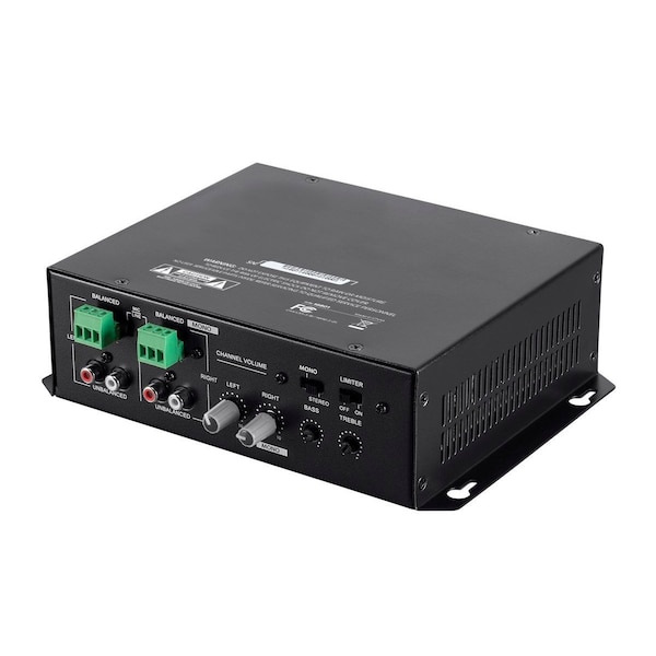 This amplifier features two 60-watt channels and offers several configuration options. You can use it as a normal 60-watts/channel stereo amplifier; as two separate 60-watt mono amplifiers; or as a single bridged 120-watt mono amplifier. It includes both unbalanced line level stereo RCA inputs as well as balanced Euroblock connector inputs for use as line or microphone inputs. It has independent volume controls for each channel; as well as bass and treble tone controls and an switchable amplifier limiter circuit. In stereo or dual mono mode it supports 4-ohm and 8-ohm loads; or an 8-ohm load for bridged mono operation. Features: Can be configured for 60-watts/channel stereo; dual 60-watt mono; or bridged 120-watt mono modes Two balanced mono inputs using Euroblock connectors Two unbalanced line level stereo RCA inputs Mic/Line switch for the balanced inputs Separate volume controls for each input Switchable amplifier limiter to prevent clipping