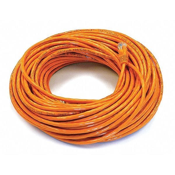Voice and Data Patch Cord, Cable Shape Round, Conductor Gauge 24 AWG, Jacket Color Orange, Overall Length 100 ft, Performance Category 5e, Shielded Unshielded, Fire Rating Commercial, Jacket Material PVC, Standards ANSI/TIA-568-C.2, E164469, EN 50288-3-2, IEC 60332-1-2, ISO/IEC 11801 ED.2, RoHS Compliant, UL Listed, Transmission Speed 1 GBps, NEC Article and Type 800 CMG, End 1 Boot Type Snagless, End 2 Boot Type Snagless, End 2 Connection Type RJ45, End 1 Connection Type RJ45