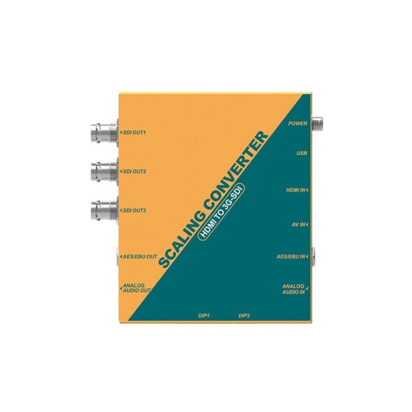 SC2031 HDMI/AV to 3G-SDI Scaling Converter Features: Input: 1x HDMI®; 1x AV; 1x AES/EBU; 1x analog audio Output: 3x 3G-SDI; 1x AES/EBU; 1x analog audio Up/down scaling and frame rate conversion AES/EBU or analog audio Embedding & De-embedding Input signal automatic detection and configuration LED indicators for power and signal lock Control easily via the DIP switches Remote control for PC via USB Threaded locking power connector Up/down Scaling and Frame Rate Conversion SC2031 features converting HDMI or AV signals to SDI signal. And the format of output can realize pass through or up/down scaling and frame rate conversion. It can support up to 1080p@60Hz. Audio Embedding and De-embedding It features embedding an external AES/EBU or analog audio or HDMI embedded audio to SDI output. Also it can de-embedding audio from SDI input signal to external AES/EBU and analog audio. There is no need for users to purchase custom cables when adopting standard 1/4" (6.3mm) TRS audio jack and 1/8" (3.5mm) audio jack. Triple SDI Outputs Transmitting and splitting the input signal to triple SDI outputs for three different connecting devices at the same time. It supports a long distance and stable transmission without loss of signal quality. Easy Control over DIP Switches Adjusting the DIP switches to set the functions by finger; without any tool. It's a smart method to change common settings quickly when outdoor applications. Meanwhile; it also can be remote set by using a software by connecting it with a PC via USB. Besides; the latest software can be upgrades by connecting it with a PC via the USB. Support Files: USB Control Application (Sep 22; 2017) HDMI®; the HDMI Logo; and High-Definition Multimedia Interface are trademarks or registered trademarks of HDMI Licensing LLC in the United States and other countries.