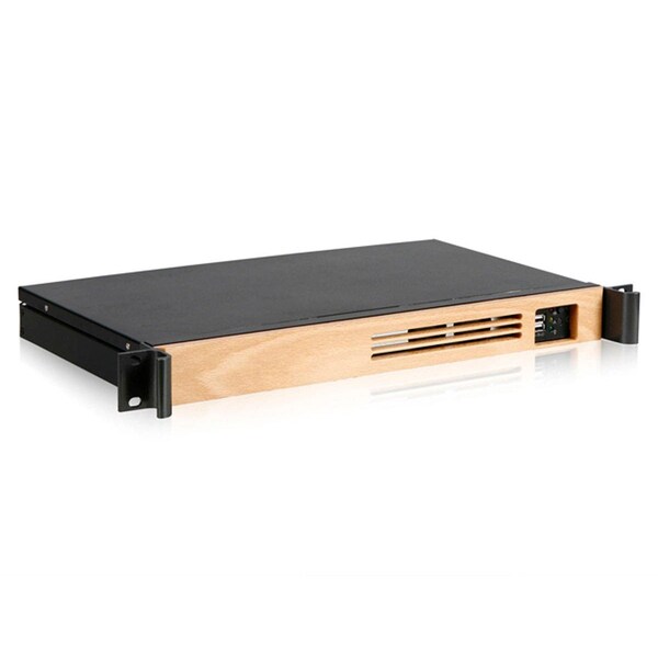 This 1U Compact Rackmount Chassis allows you to pack a powerful server into a tiny package. It accommodates Mini ITX motherboards (6.7" x 6.7"); as well as either a single 3.5" or two 2.5" hard drives. The case supports a single expansion slot; though if the expansion slot is used; only 2.5" HDDs will fit inside the case. The case is constructed of steel with a wood front bezel. The front of the case features power; HDD activity; and LAN activity LEDs. It features two front-panel USB 2.0 ports and space for three front-mounted 40mm cooling fans (not included). It supports 1U Flex power supplies (not included). Features: 1U rackmount space Supports Mini ITX motherboards Supports 1U Flex ATX power supplies Steel construction with wood front bezel Supports 1x 3.5" or 2x 2.5" internal drives 2x USB 2.0 front panel connectors Optional 3x 40mm cooling fans (not included) Support for up to 1 expansion slot Power supply NOT included