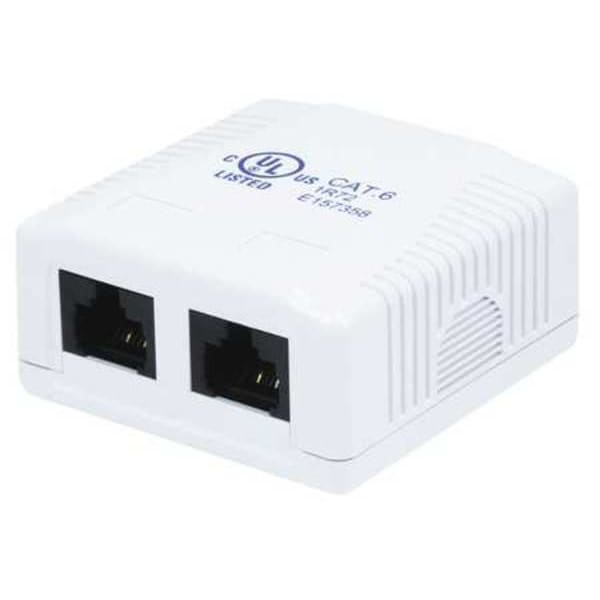 Surface Mount Box, Compatible Module Type Keystone, Number of Ports 2, Color White, For Use With Wall Mount, Includes (2) Screws, Double-Sided Tape, Manufacturer Warranty Length Lifetime, Overall Depth 2 3/8 in, Overall Height 1 1/8 in, Overall Width 2 3/8 in, Standards ANSI/TIA/EIA 568 B.2-1