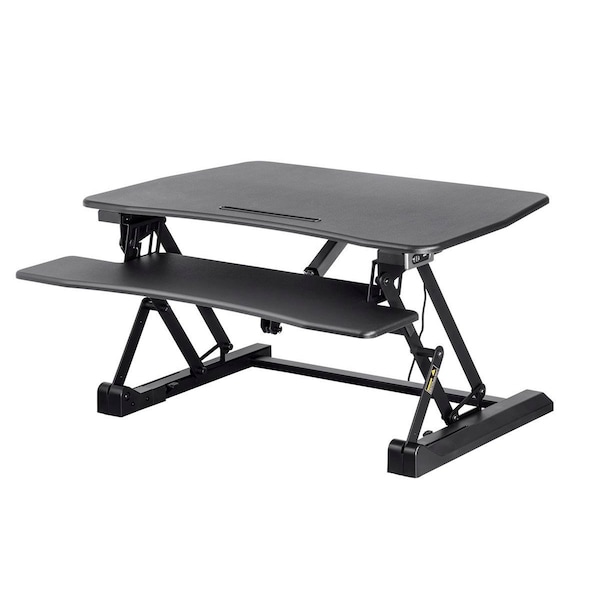 This motorized sit-stand desk converter provides an easy height-adjustable desk solution. The electric motor does the heavy lifting; so anyone can easily adjust their desk height with a simple touch of a button. This desk converter works with most desks and cubicles; giving employees and students a flexible; adjustable; and comfortable workstation setup. Enjoy the health and productivity boost from changing positions throughout the workday. The top surface is big enough for a laptop or a multi-monitor setup and the keyboard tray provides ample space for a full-sized keyboard and mouse. An integrated USB charging port is built into the control panel; giving you a convenient solution for keeping your smartphone or tablet fully charged. Motorized Height Adjustment Easy Desk Conversion Ample Workspace Motorized Height Adjustment: Easily convert from a sitting to a standing position and back with a simple touch of a button. The electric motor does the heavy lifting and lowering for you. An additional level of convenience is provided by the integrated USB charging port in the control panel.Easy Desk Conversion: Use with any desk; table; or flat work surface with enough space for the converter to get a height-adjustable sit-stand workstation.Ample Workspace: The top surface is big enough for a laptop or a multi-monitor setup and the keyboard tray provides ample space for a full-sized keyboard and mouse. Sit-Stand Height AdjustableAdjustable from 5.9"-18.9" top surface height to easily convert between a sitting and standing position. Full Desktop SpaceThere is more than enough room for a laptop or multi-monitor PC setup;plus a full-sized keyboard and mouse. Works with Most DesksDesigned to fit on most desks to provide instant height-adjustability to your workstation. Super Easy-to-UseEnjoy smooth and effortless adjustment thanks to the electric motor.One-touch button operation allows the desk to lock into any position for the perfect fit. Ideal for Buy with Confidence Monoprice not only stands behind every product we sell with a 1 year replacement warranty; we offer a 30-day money back guarantee as well! If the product you purchase does not satisfy your needs; send it back for a full refund.Quality at a Fair Price Monoprice's rugged design and rigid quality control standards deliver high quality products at fair prices.Hassle Free Packaging Monoprice exists to bring simplicity; fairness; and confidence to technology choices. This product features recyclable packaging that is simple to open; cost effective; with minimal waste; and fully protective as it travels to you.Service & Support You're never on your own with Monoprice products! We have a full team of friendly and knowledgeable technicians available to answer your questions; both before and after the sale. Contact our technical support team for questions about our products; troubleshooting; or even suggestions for products to fit your particular needs. Not to be outdone; our friendly and helpful customer service team is here to make your ordering; delivery; and any possible returns a quick and painless operation; from start to finish! WORKSTREAMTM and the WORKSTREAM logo are trademarks of Monoprice Inc.Updated Jan 24; 2020