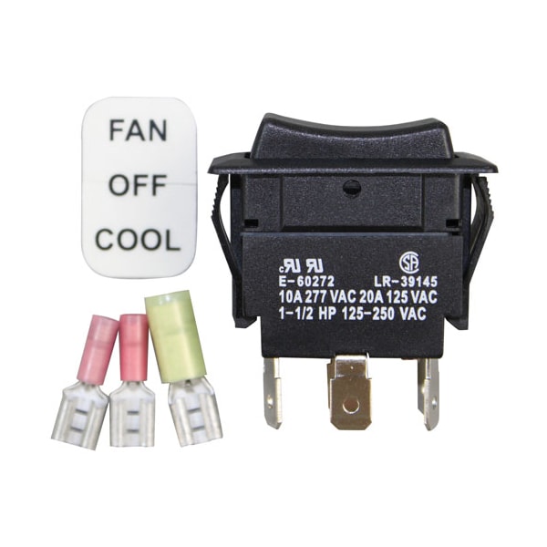 Rocker , Fan-Off-Cool;On/Off/On, (6) 1/4" Tab Term, 10A 277Vac, 20A 125Vac ;Comes With Two Connectors And A On/Off/Cool Sticker;Montague 136 Legend Series, & Convection V Series