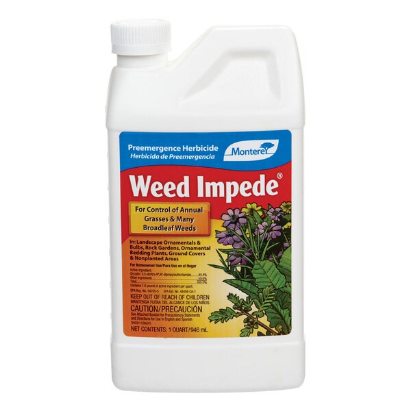 Weed Impede herbicide is a preemergence surface-applied product for the control of many annual grasses and broadleaf weeds in ornamental plantings rock gardens ornamental bedding plants bulbs ground covers/perennials and established warm-season turfgrass.