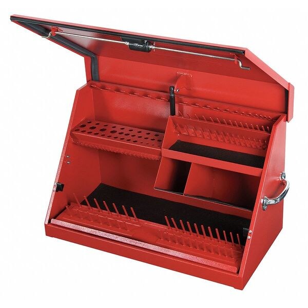 Portable Tool Box, Material 16 gal. Steel, Overall Depth 15 in, Overall Height 18 1/8 in, Overall Width 30 in, Locking System Lock Cylinder with Double Cut Keys, Color Red, Configuration 106 Pegs, 35 Slot Holes, 2 Cubbys, 2 Lift-Up Trays For SAE and Metric Sockets and Tools