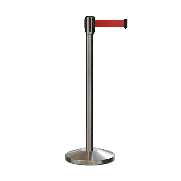 Retractable Belt Barrier Stanchion, 2" Sat.Steel Post 7.5'Red Belt (Discontinued)
