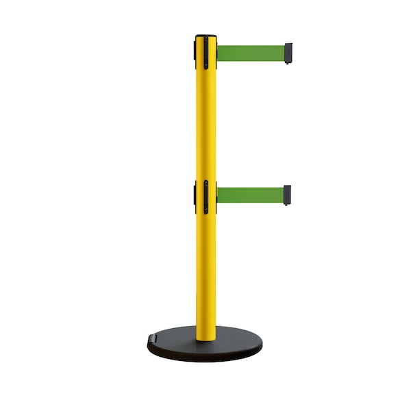 Retractable Belt Dbl Rolling Stanchion, 2.5ft Yellow Post 11ft. Green