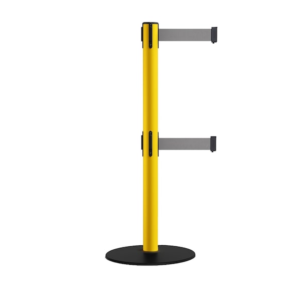 Retractable Dbl Belt 2.5" YW Post , Low Base, 7.5'Lt Gry Belt