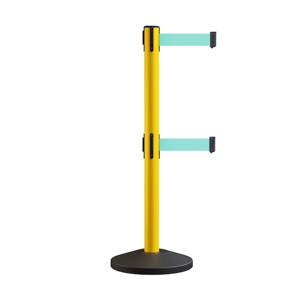 Retractable Dbl Belt Rolling Stanchion, 2.5in YW Post 7.5'Lt Grn Belt