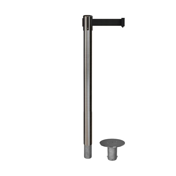 A retractable belt barrier with 2.5" diameter post and 5” floor socket allows for fixed, removable installation, maintaining clear floor space and minimal tripping hazards while the stanchion is in place. A socket cap allows for discrete socket closure when the barrier is no longer needed. These versatile stanchions are designed to sustain daily use with built in belt braking technology to prevent belt damage with retraction. High quality belts extend to lengths of 7.5 feet, 9 feet, or 11 feet and come in a wide variety of colors and messaging.