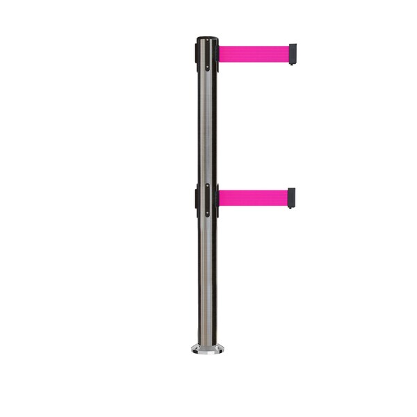 Stanchion Dual Belt Barrier Fixed Base Sat.Steel Post 9ft.Fl.Pnk Belt (Discontinued)